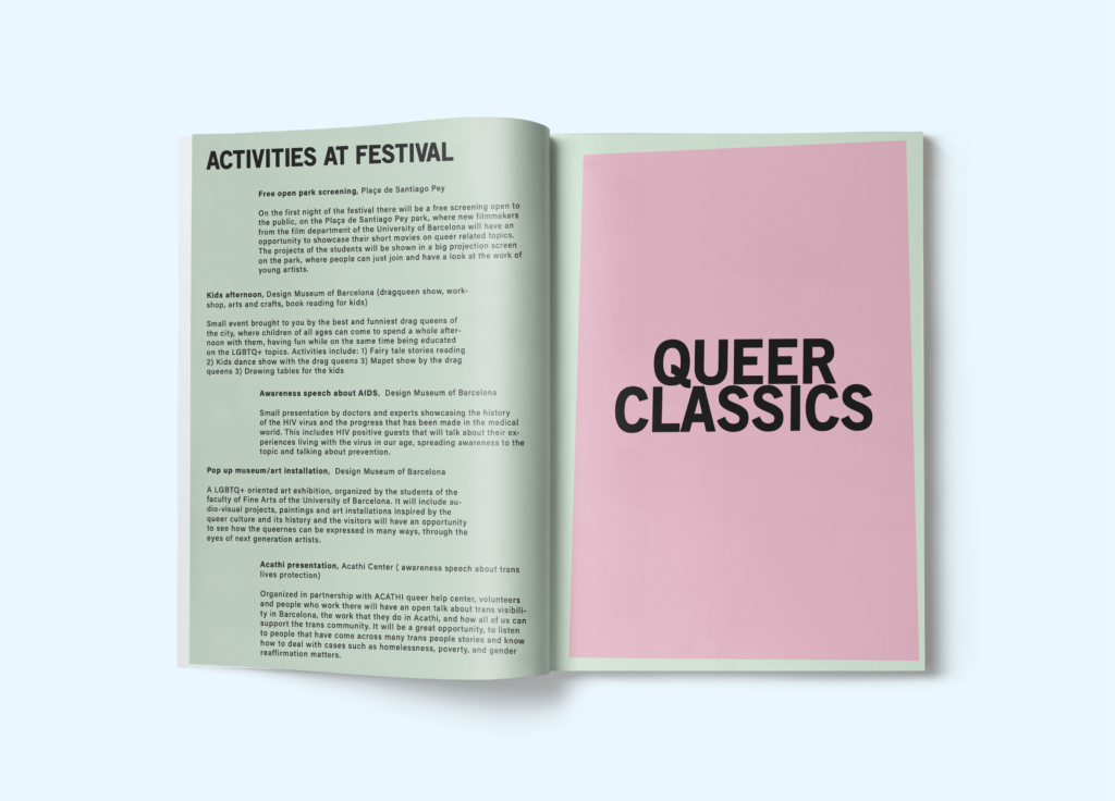 In 2022 ben ik op study abroad gegaan in Spanje, waar ik een minor Communication & Journalism volgde. In deze periode heb ik met een vijfkoppig internationaal team gewerkt aan de opzet en organisatie van een nieuw Documentary Film Festival. Zo kwam het concept Queer-In Festival ter wereld. Dit Queer film festival is een driedaags drive-in-cinema concept, dat plaatsvindt in Barcelona. De nadruk van het filmfestival ligt op awareness rondom LHBTIQA+. Omdat het onderwerp ‘Queer’ per tijdsperiode zo verschillend is benaderd binnen de filmwereld, is de filmselectie gebasseerd op werken van het verleden, het heden en de toekomst.
